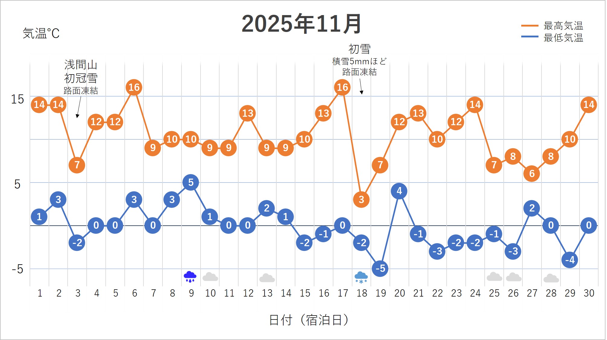 - 下旬:日中10~5℃前後、夜は5~-5℃前後