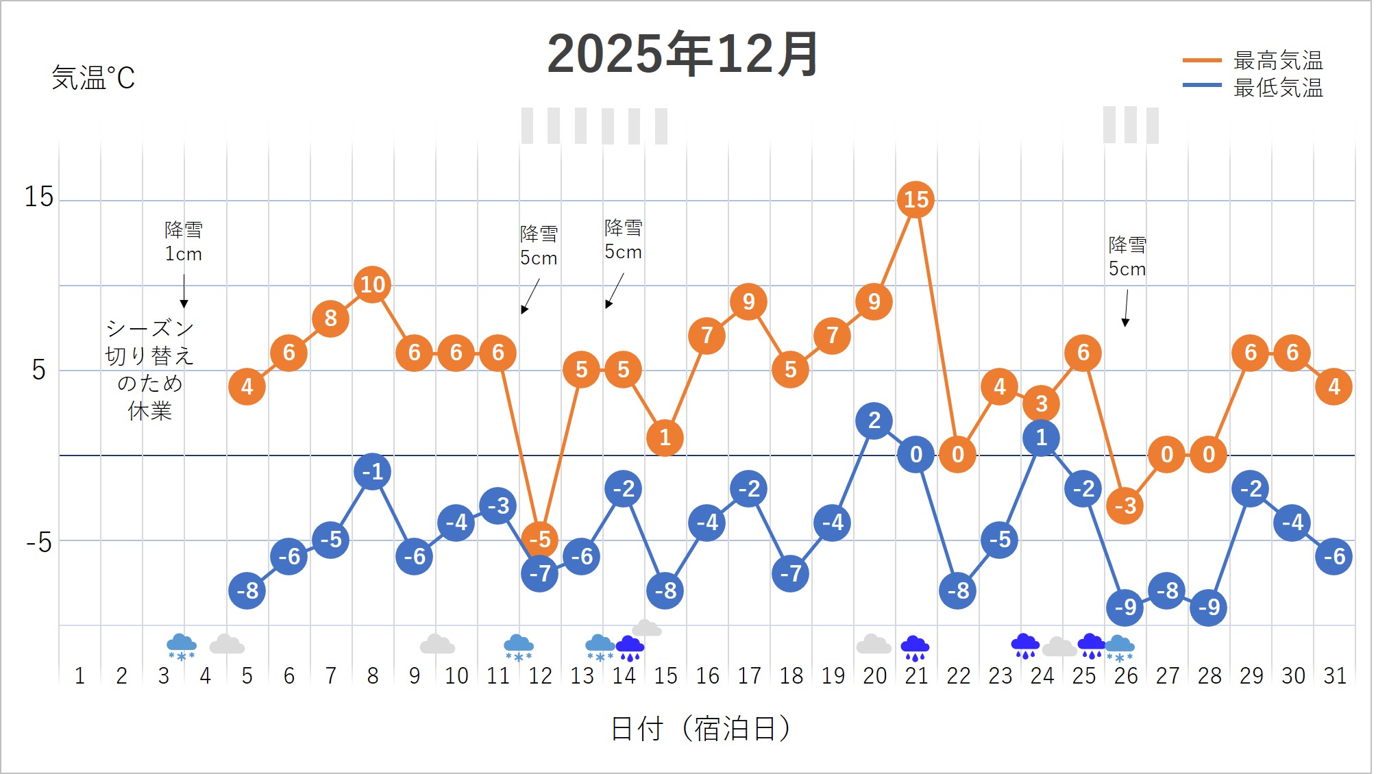 最高気温:10℃を超す日もあれば、終日氷点下の日もあります。