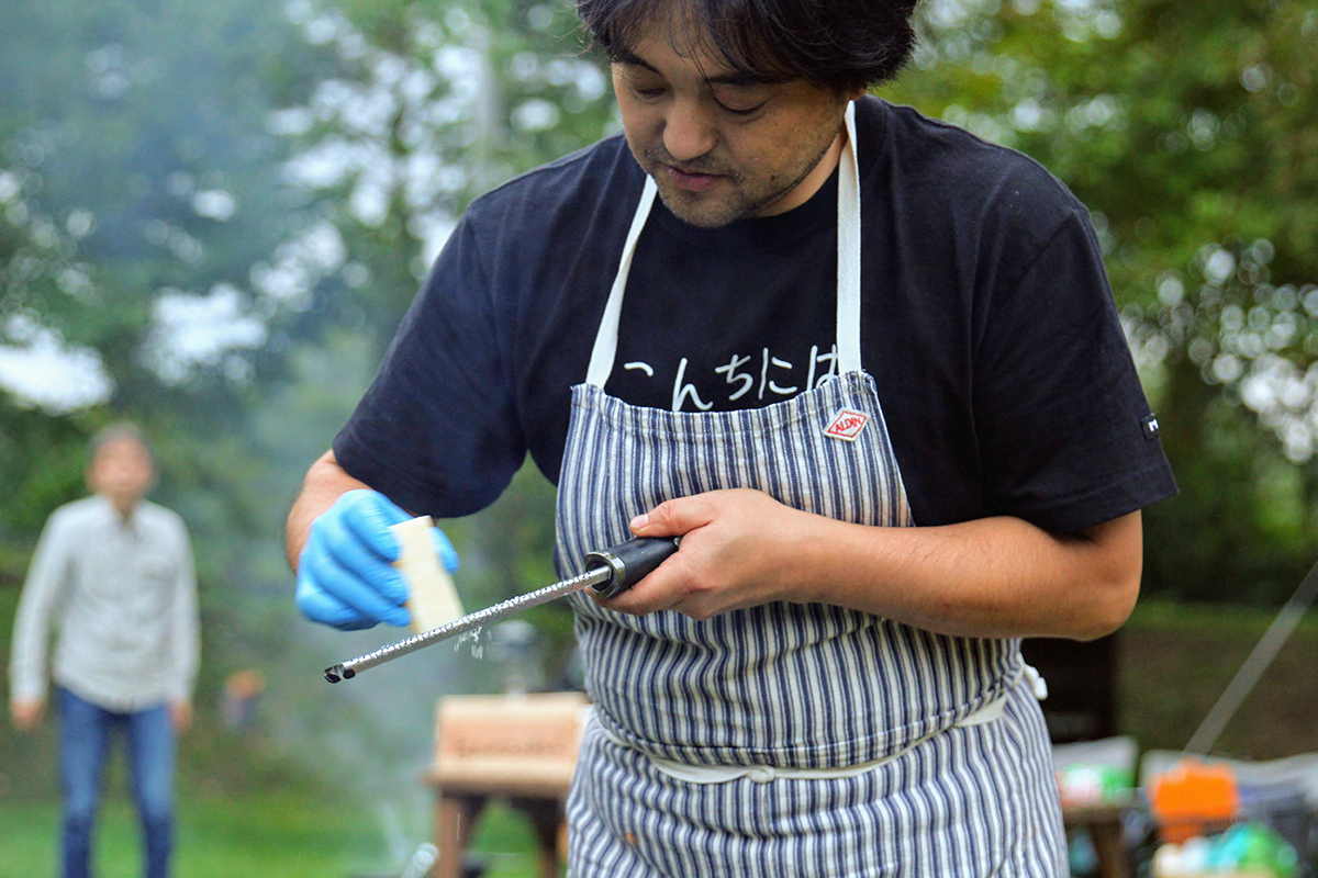 このコース料理には、きたもっくの蜂蜜はもちろん、製材時に出るおがくず(おがこ)を使った菌床で育てた地元のきのこ農家の薪火焼ききのこなど、この地の自然循環を実感できる食材を取り入れる。