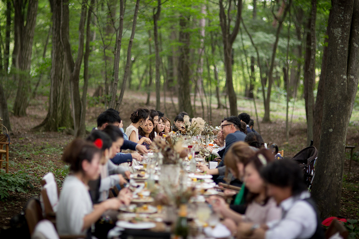 場の魅力はもちろん、地域の自然風土と循環を感じられる食体験を重ね合わせることで、ここでしか実現し得ない、特別な一日を創出する。式典利用などのお問い合わせはルオムの森、もしくはTAKIVIVAまで。