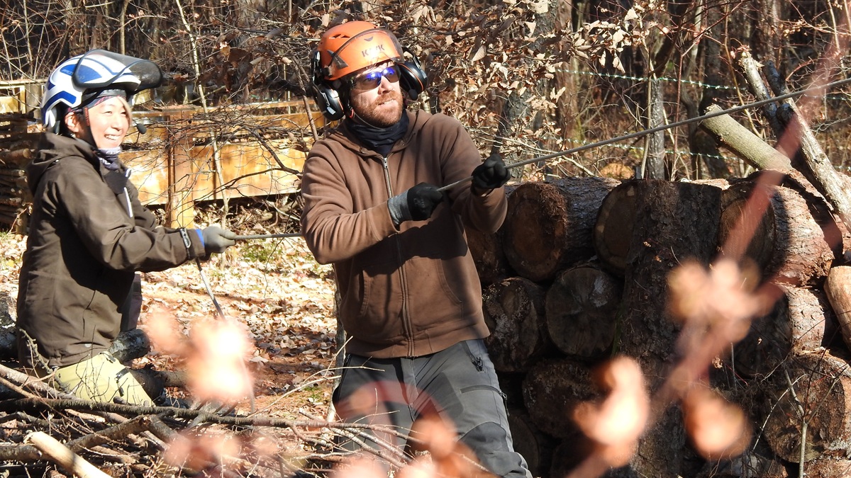 簡単そうにやってのけるこの作業に、いったいどれだけの技術がつまっているのか…。樹種にもよるが、生きている木は水分を含んで重い。太さによっては1トンを越える。倒す方向をコントロールする、というのが簡単ではないことは、素人でもわかる。