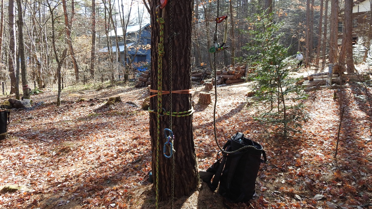 ▼下で受け止める人がロープの張り具合を調整、受け止める人が上手だと木が揺れない(重い部分を下ろすときは、信頼できる人じゃないとこわいらしい)先輩が新人にコツを伝授中