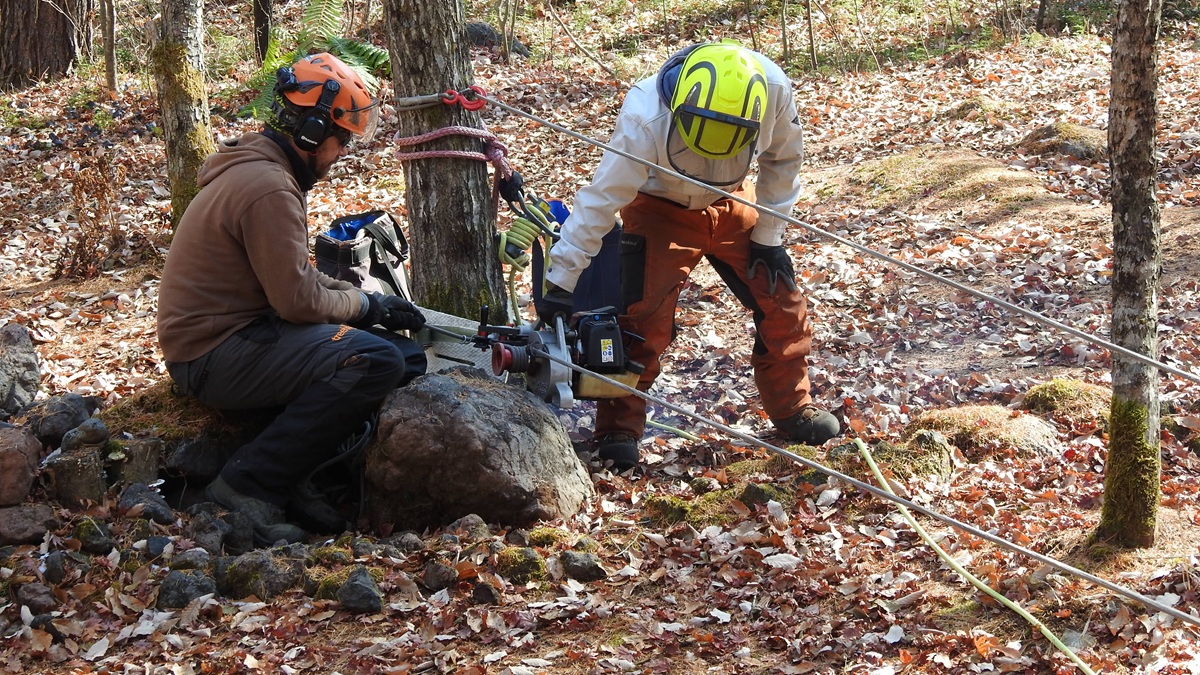 根元から伐るカラマツにロープを通し、滑車とエンジンウインチを使って倒したい方向へ引っ張る。チェンソーで受け口を慎重に切る。