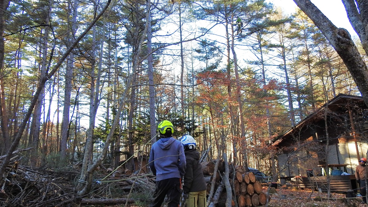 木を伐る場所は、山だけではない。北軽井沢周辺は人の生活圏にも立派な木々が当たり前にある。高木の特殊伐採や剪定を請け負うのが、あさまのぶんぶんのアーボリチームだ。今回は別荘地の木を伐るアーボリチームを取材した。この日は、あらかじめ家主と相談した4本の木を伐る予定。