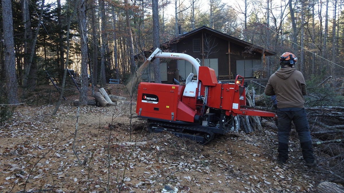 気づけばカラマツは3本とも伐採終了、枝はチッパーでウッドチップへ