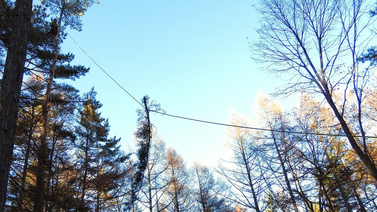 伐採予定の4本のうち、3本のカラマツは干渉せずに伐り倒せそう。のこりのアカマツは、家に近く電線からの引き込み線が50cmほどの距離にあるため、上から順に細かく切ることになった。
