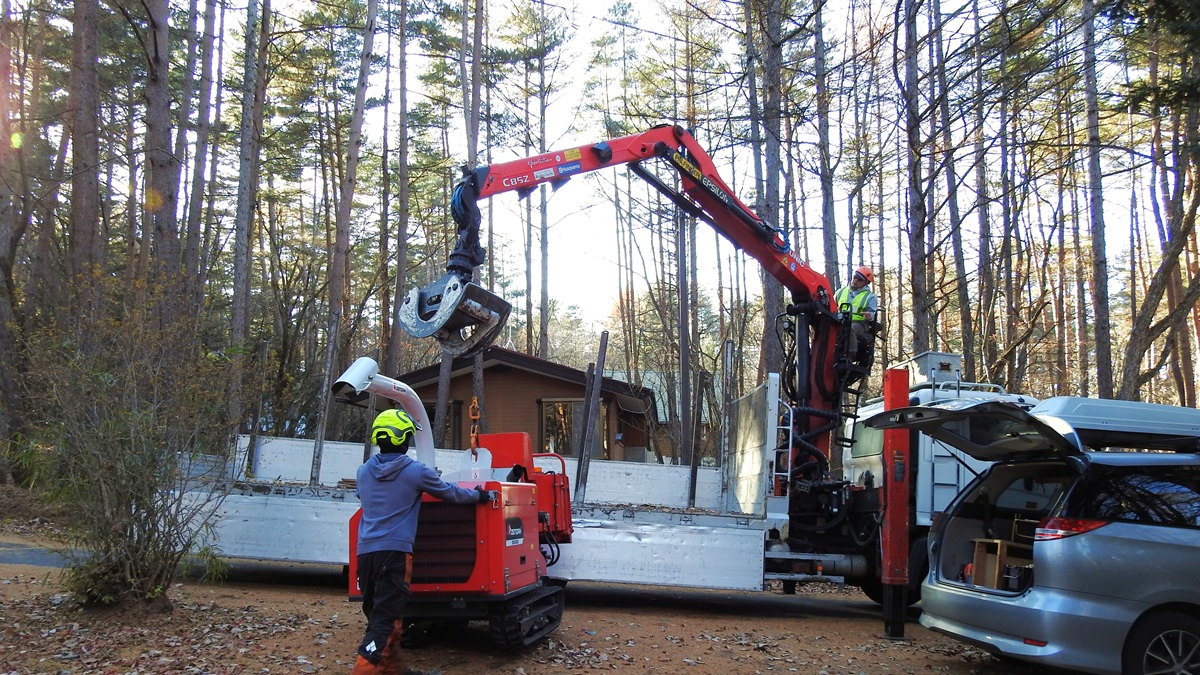 ただ、伐採した木の積卸しは手作業だと時間がかかる。原木チームがユニックで駆けつけ助けてくれることもしばしば。