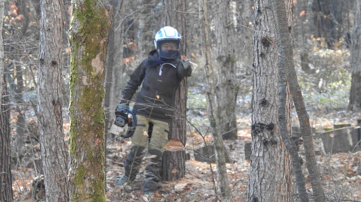 かたやカラマツを伐っている横で、アカマツの伐採準備が進んでいく。