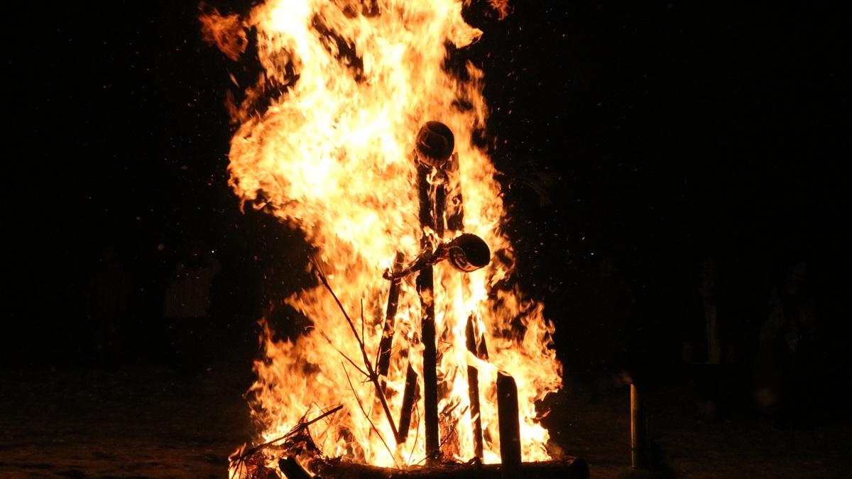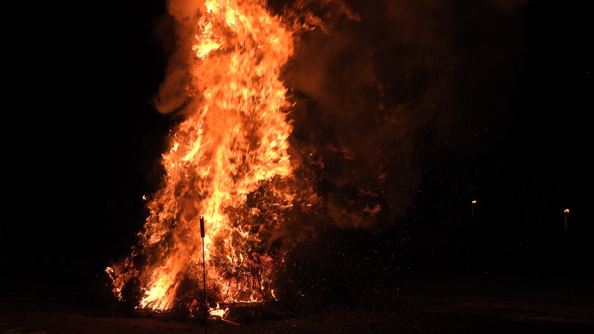 モミが勢いよく燃えあがり、竹が爆発しながら燃える。その大きな音にこどもが泣いちゃうくらい迫力満点な炎。