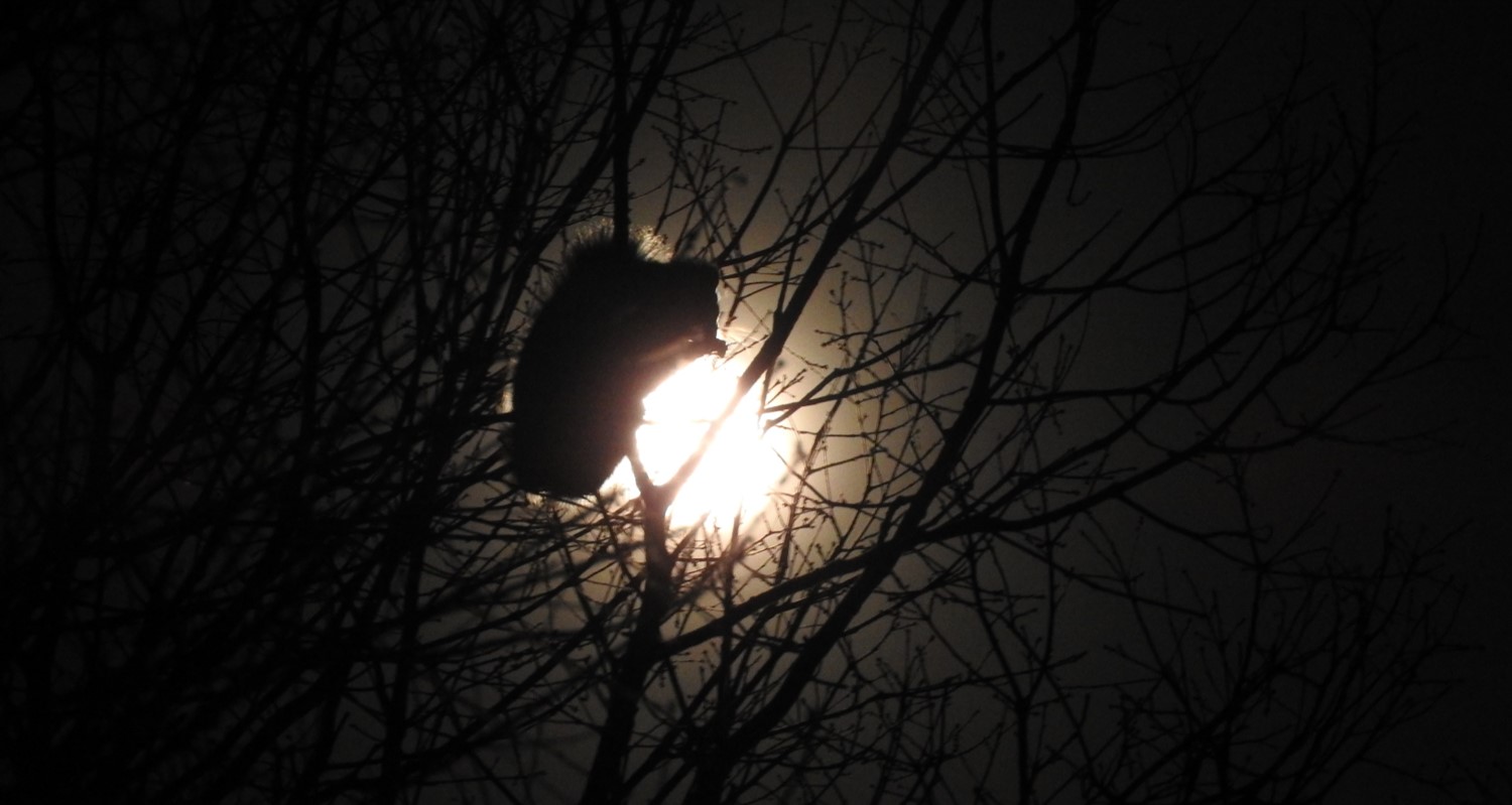 ▼月明かりに照らされたムササビ、夜は彼らの時間帯!無心にナラの冬芽を食べていた(2019年1月19日おしぎっぱの森で撮影)
