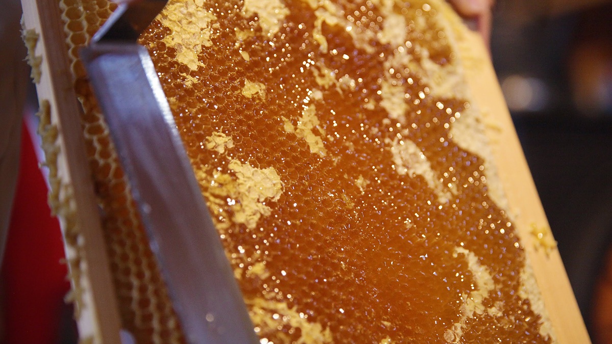 ▼削った蜜蓋や巣…精製すると六角形ではなくなってしまうが、暖かみのある黄色とほんのり甘い香りが残る