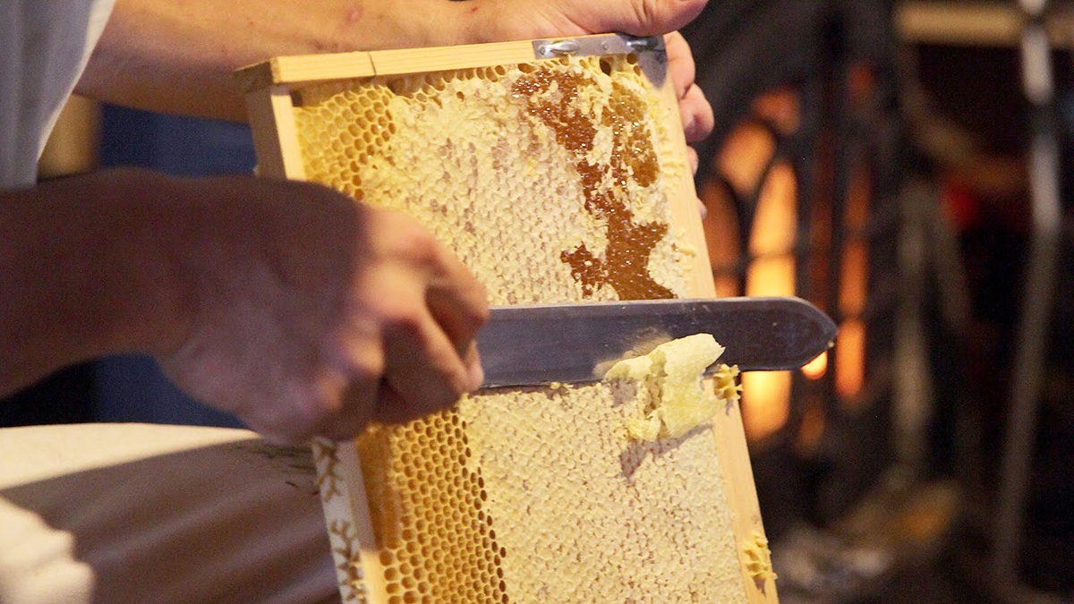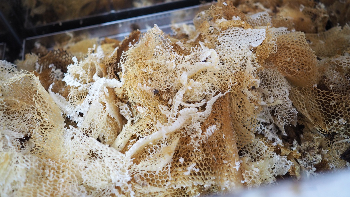 はちみつを採取する際に切り取る蜜蓋(はちみつの糖度が80%前後になるとミツバチが完成の印にする蓋のこと)や、木枠からはみ出して作られた巣(通称ムダ巣)を精製して使用する。