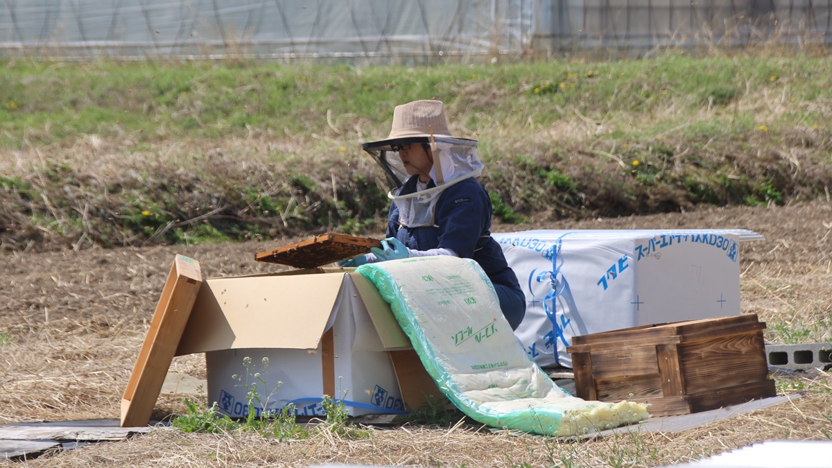 日差しがある暖かい日には、ハチたちが元気に過ごせているか一軒ずつそっと中を確認。