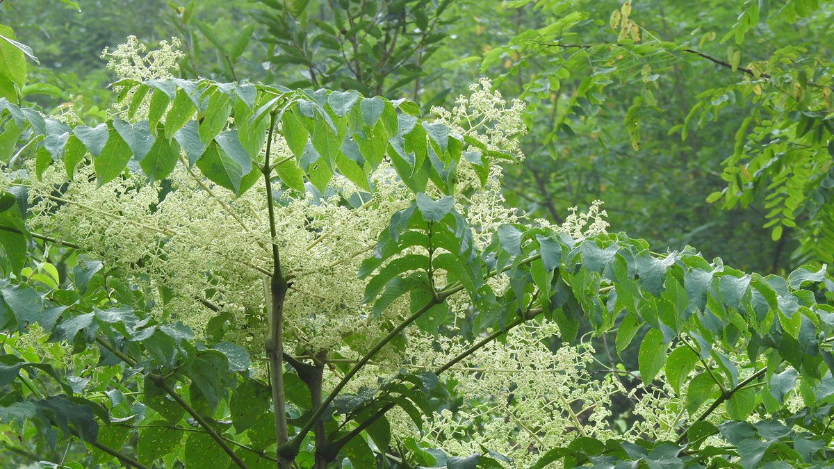 ▼花が減る時期に咲くタラノキの花。秋は標高が高い場所から順に低い方へ開花していく。