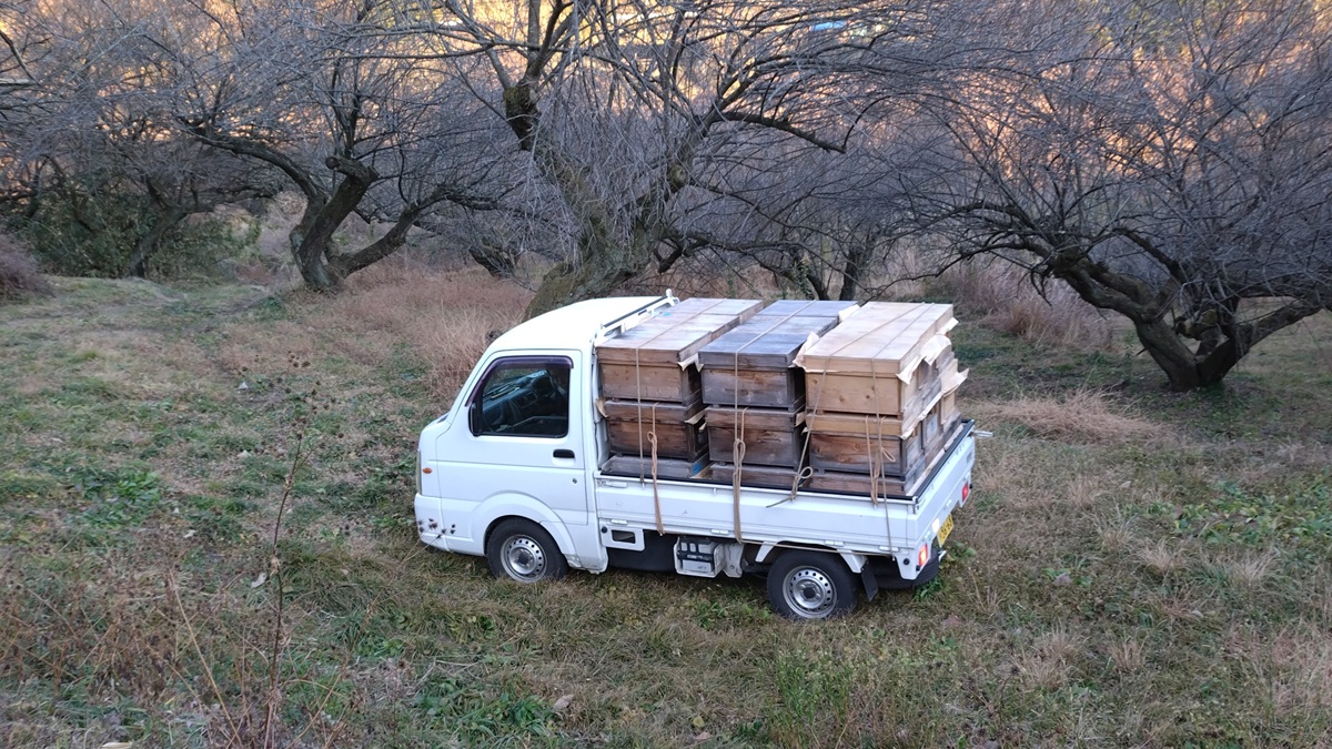 ミツバチたちは、夜には巣箱に戻るため、お引っ越しは夕方~夜に行います。軽トラックに積み込んで、揺れないようにしっかり固定。