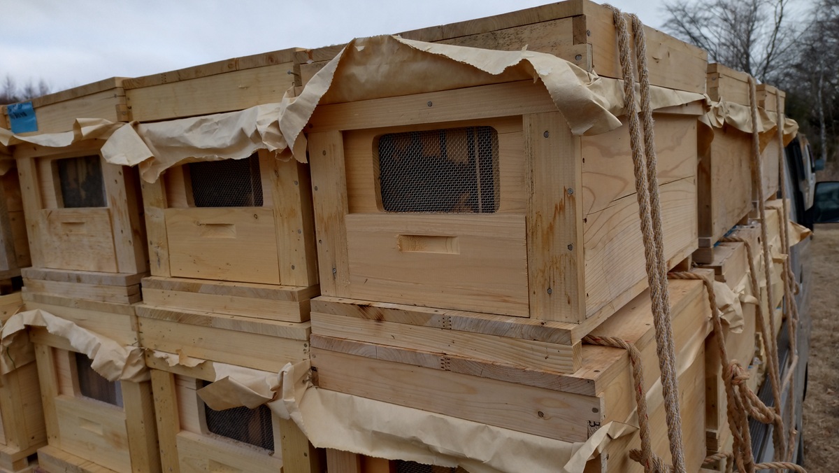 採蜜時期(春夏)は巣箱の段が増えるので、2人1組で積卸し。日が長くハチがなかなか帰ってこないので作業を終えるのが深夜になることも。その点、冬のお引っ越しは1段ずつなので1人で持てる、ハチの帰宅も早いので夕方から作業をすすめられ、大変な引っ越し作業もやってみたら案外なんとかなったそう。