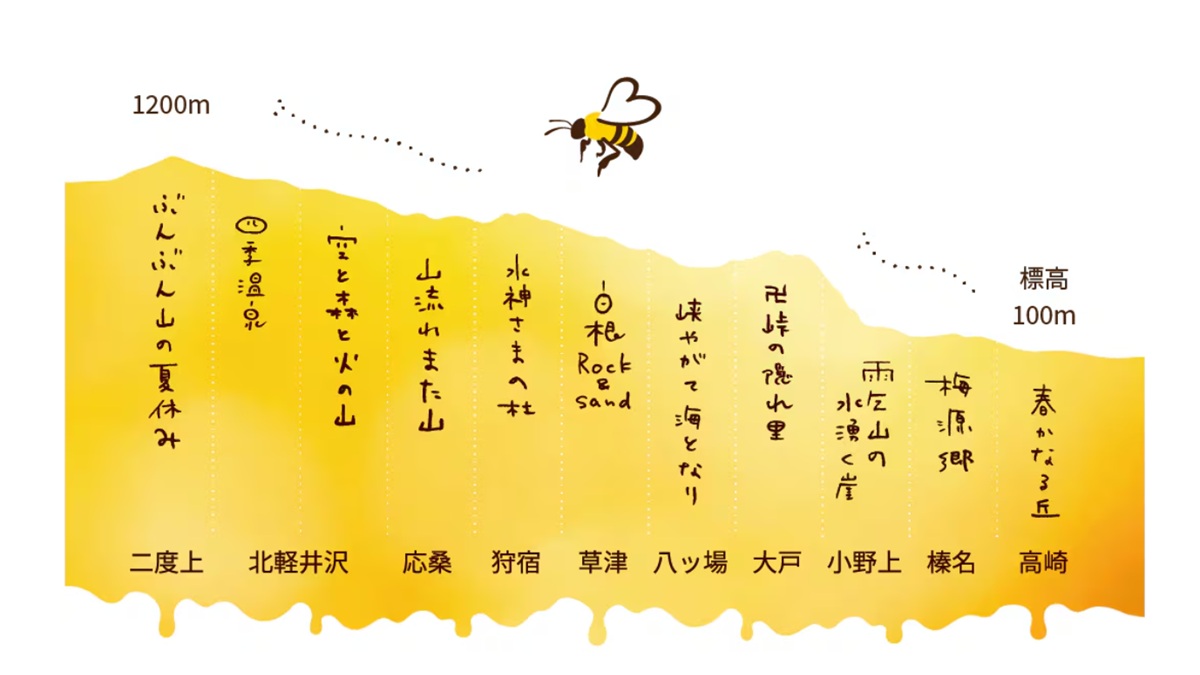 ぶんぶんのミツバチたちは、群馬県内約10ヶ所、高崎から北軽井沢まで花の開花を追って旅をしながら蜜を集めます。